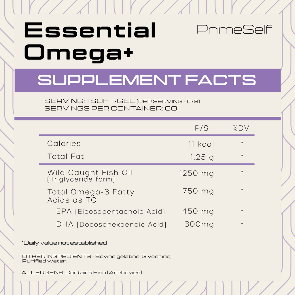 PrimeSelf Essential Omega+ delivers 750 mg of EPA+DHA per softgel (450 mg EPA | 300 mg DHA) in the highly bioavailable triglyceride (TG) form - sourced from wild‑caught anchovies and verified using IFOS™ 5‑Star certified raw material. Expect clean absorption, ultra‑low oxidation, and no fishy aftertaste - just results you can feel across focus, heart, recovery, and resilience.