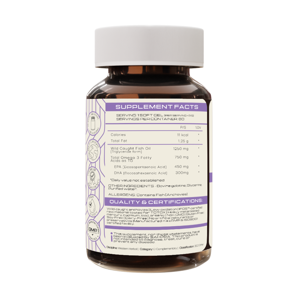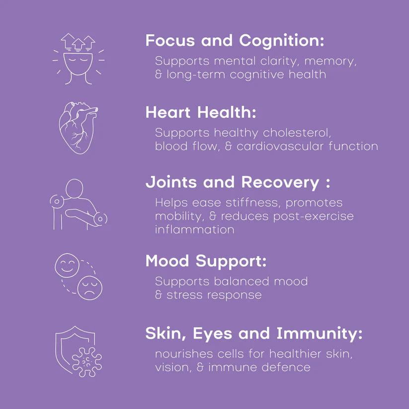 Why it matters: Modern diets are chronically low in omega‑3s. This daily essential supports cognitive clarity, cardiovascular function, joint comfort, recovery, mood, skin, vision and immune balance, without compromises in dose, form, purity, or sustainability.